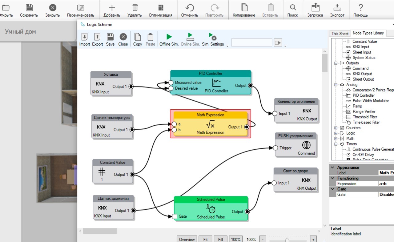 Логические операции (AND, OR, XOR) и математические функции, основанные на значениях, входящих в группы KNX, могут быть созданы с использованием простых и интуитивно понятных интерфейсов.