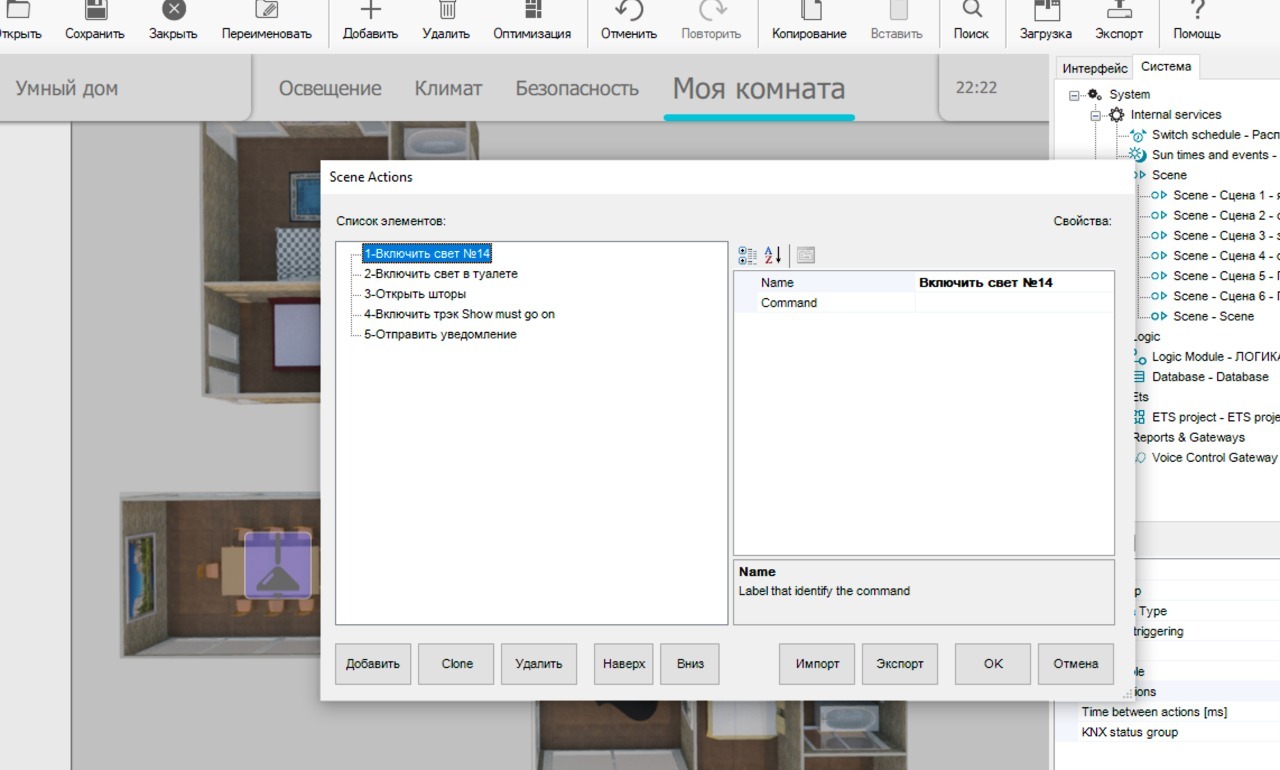 Система позволяет переводить заданные действия в зависимости от команды или определенного значения, передаваемого шиной KNX (или других интегрированных систем).