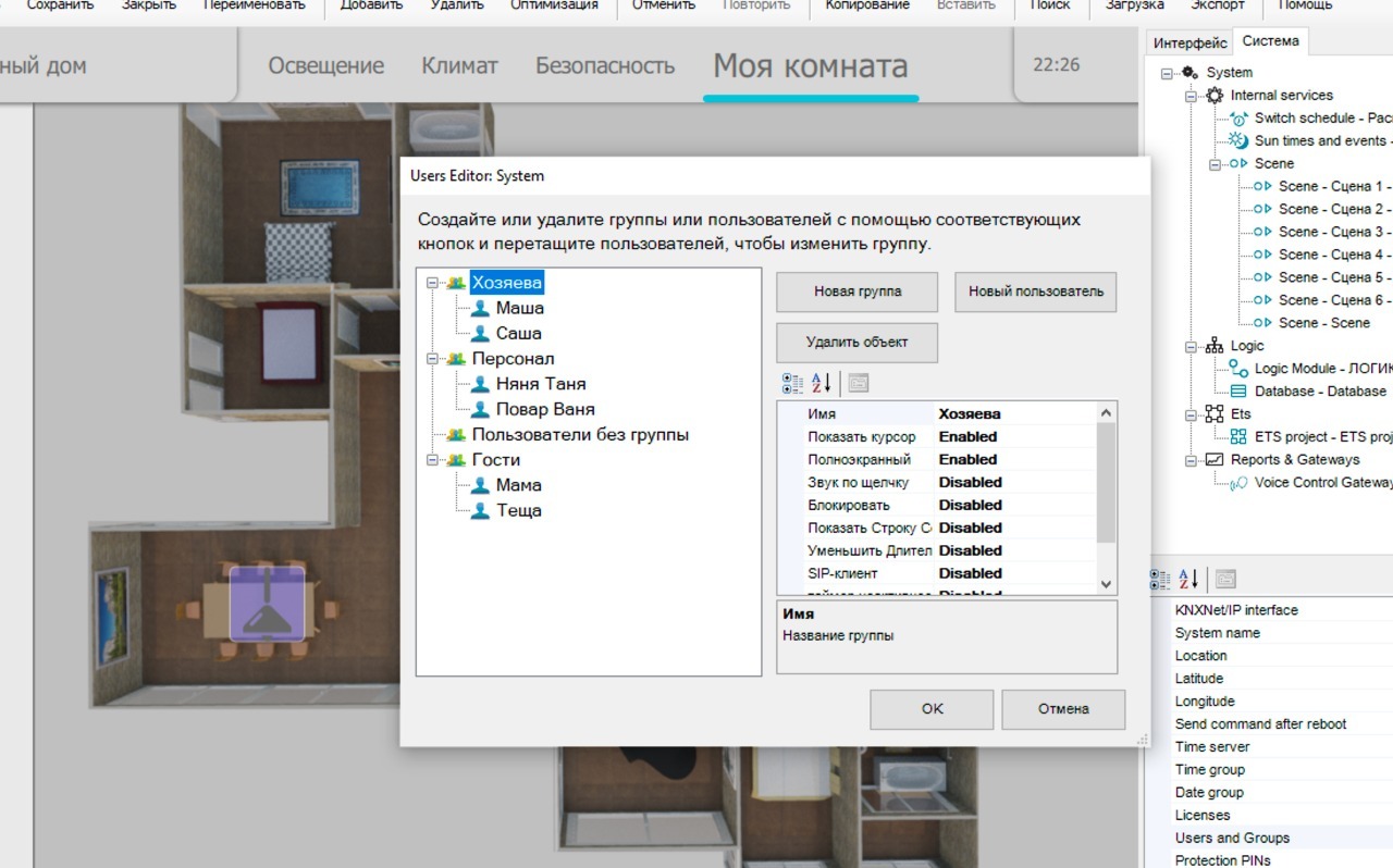 Двигатели штор и жалюзи имеют свою группу в системе KNX и имеют несколько режимов для перемещения, остановки и получения обратной связи от электродвигателя.